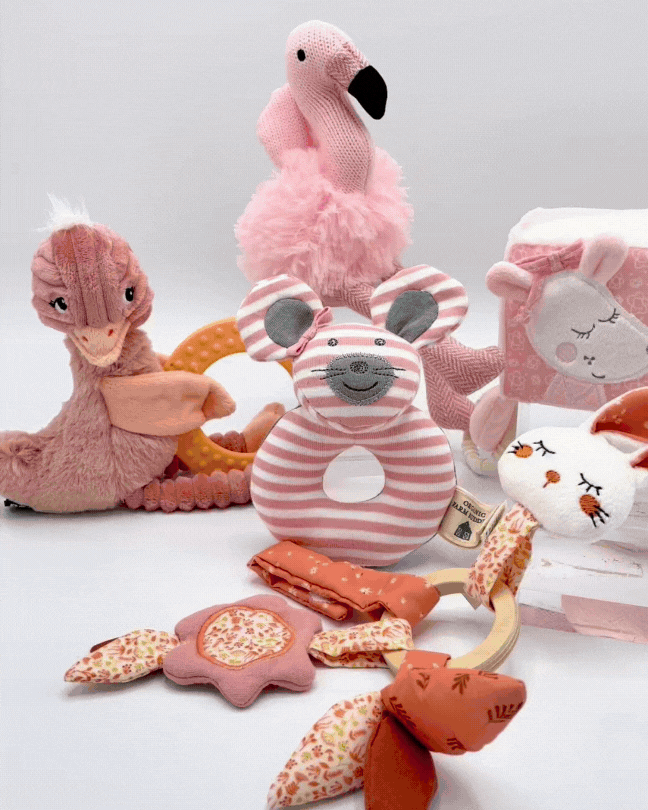 Featuring an Ostrich Baby Toy that has a detachable silicone teether, a GOTS-organic Pink Mouse Baby Rattle that is the sweetest little toy, a fluffy Flamingo baby toy that rattles and a Bunny Rabbit Baby Activity Toy that features endless playtime elements that’ll help with your baby’s fine motor skills, our Blush Pink-themed baby toy box will add hours of fun to your playtimes.